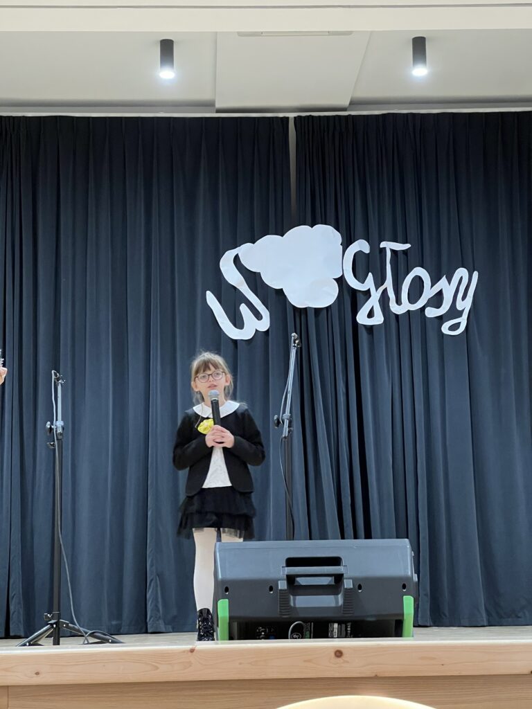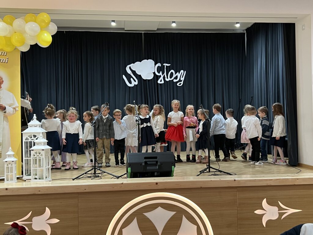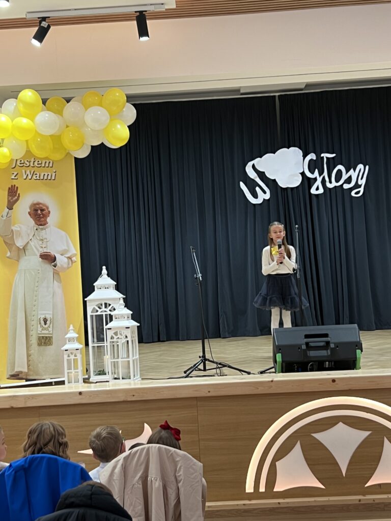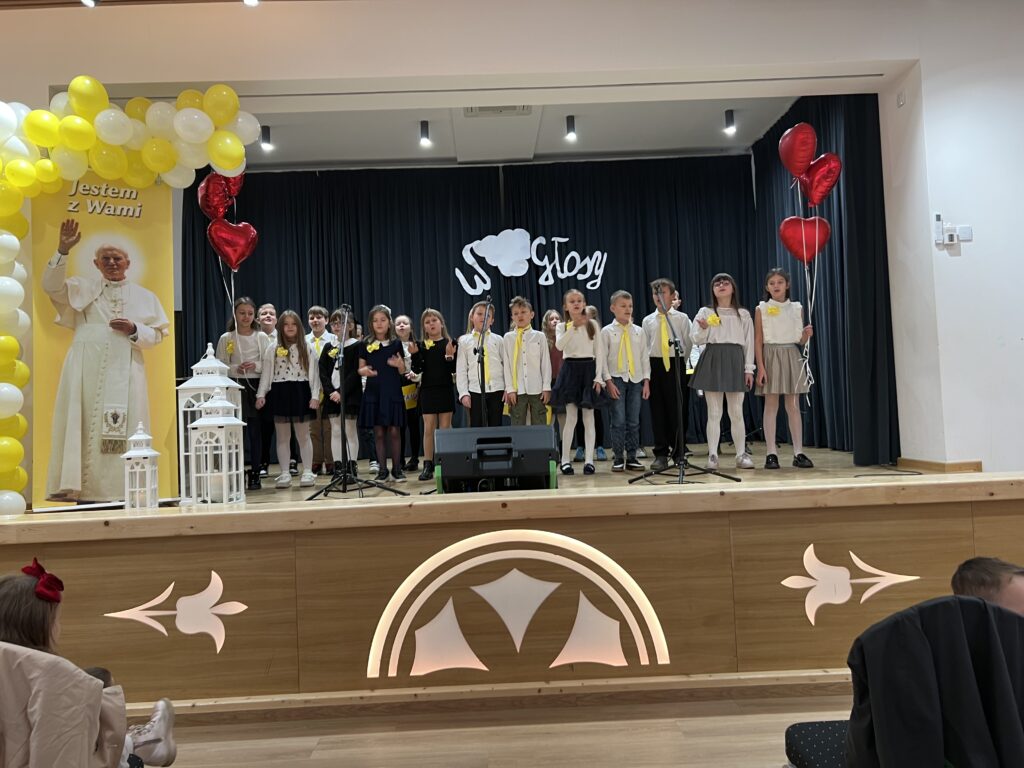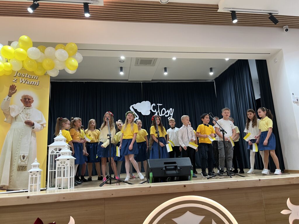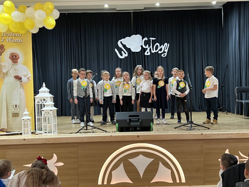 22 października w naszej szkole odbył się koncert Wniebogłosy – poświęcony pamięci Świętego Jana Pawła II. Dzieci z Przedszkola oraz każda z klas naszej szkoły zaprezentowała jeden utwór muzyczny, którym oddała hołd Papieżowi Polakowi. Nie zabrakło również występów solowych. To był piękny koncert, wypełniony muzyką, żółto-białymi kolorami i dziecięcym śpiewem, który niewątpliwie trafił w tym dniu do samego nieba.